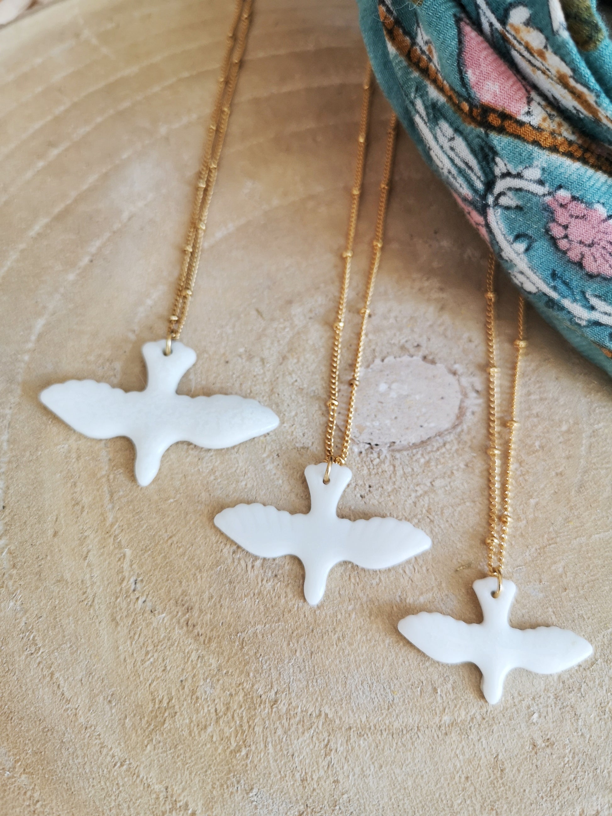 Une colombe en porcelaine montée sur une chaîne à maillons et petites billes.