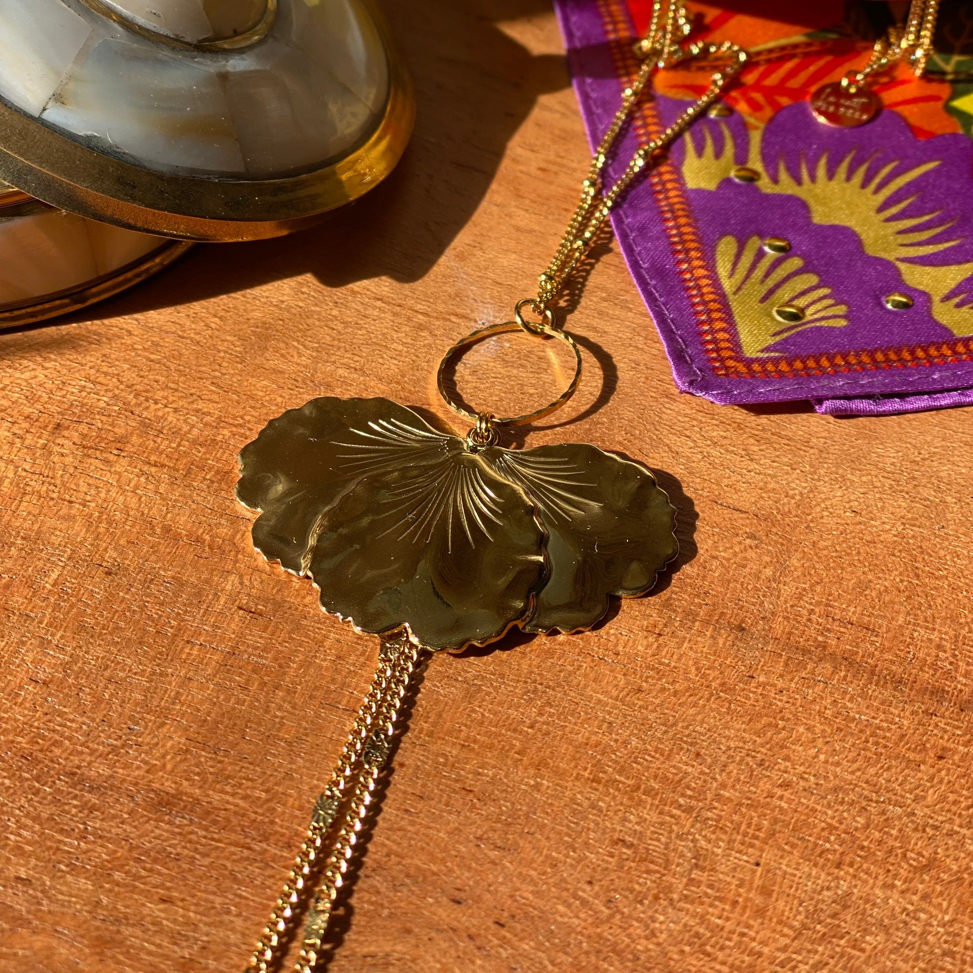Le sautoir Iris fait partie de la collection végétale, entièrement doré à l’or fin, une élégante fleur en guise de pendentif, ainsi qu’une chaîne à maillon fin et petites billes.